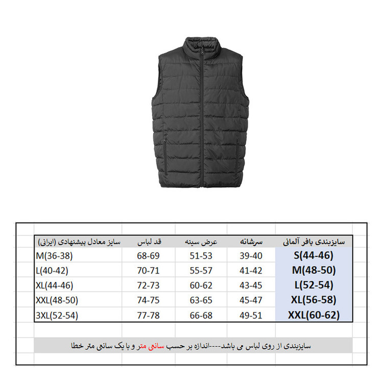 جزئیاتاین محصول بر اساس سایزبندی آلمانی و قواره دار است لطفأ برای انتخاب سایز به جدول سایز ارائه شده مراجعه فرمایید. (حجم لباس حدودأ 0.5-1 سانتی متر از هر طرف لحاظ شود.)