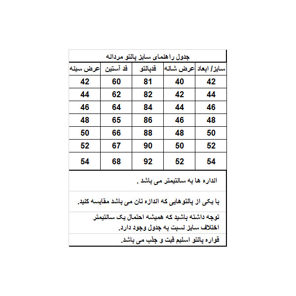 مناسب برای مراسم و محافل می باشد. داخل پالتو آستر با کیفیت عالی به کار رفته است.این پالتو حالت جذب دارد . لطفا به جدول اندازه گیری ها دقت فرمایید و متناسب سایز خود انتخاب نمایید .پارچه این پالتو بادارا بودن لایه پوششی داخل پارچه باعث بالا رفتن طول عمر محصول شده و بولدینگ داخل پارچه سبب گرم تر ماندن بدن و نفود ناپذیر بودن اب میشود .