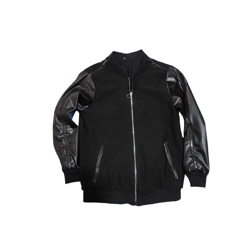 کت اسپورت مردانه آستین چرم زیپ دار بدون کلا ،رویه دونخ حالت کشسان دارد آستر پارچه نخ کار شده آستین و دمپا کش کار شده در دو سایز L و XL به رنگ مشکی است