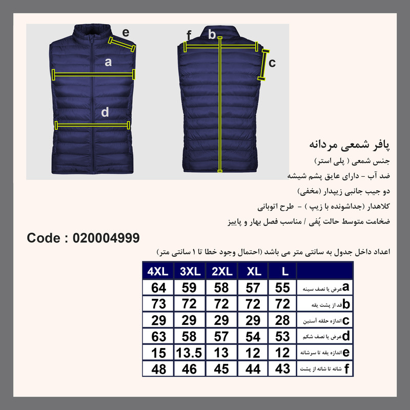 پافر شمعی مردانه تولید برند پاتن جامه می باشد. پافر پاییزه شمعی از جنس پلی استر (ضد آب و بادگیر ) دارای عایق پشم شیشه گرم نسبتاً ضخیم می باشد. پافر کلاهدار (جداشونده توسط زیپ) بدون آستین دارای دو جیب زیپ دار مخفی جانبی می باشد (دو جیب داخلی) جهت اطلاع از اندازه دقیق به جدول اندازه در آلبوم تصاویر دقت فرمایید.