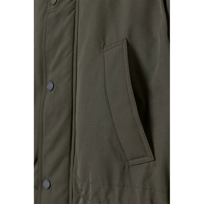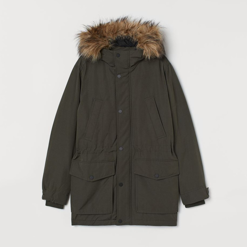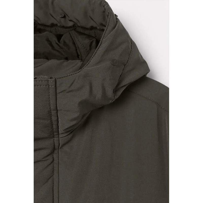 پارکای بالشتکی از پارچه بافته شده با یقه بلند و کلاه با روکش خز مصنوعی قابل جدا شدن. زیپ و بادگیر با پرس ناودانی در جلو، جیبهای دستگرم دار با روکش پشمی، جیبهای جلویی وصله دار با فلپ و میخ پرس، و یک جیب داخلی با میخ پرس. زبانه تا حدی پنهان با یک دکمه و نوارهای داخلی در سرآستین و یک بند کشی پنهان و کش دار در کمر.