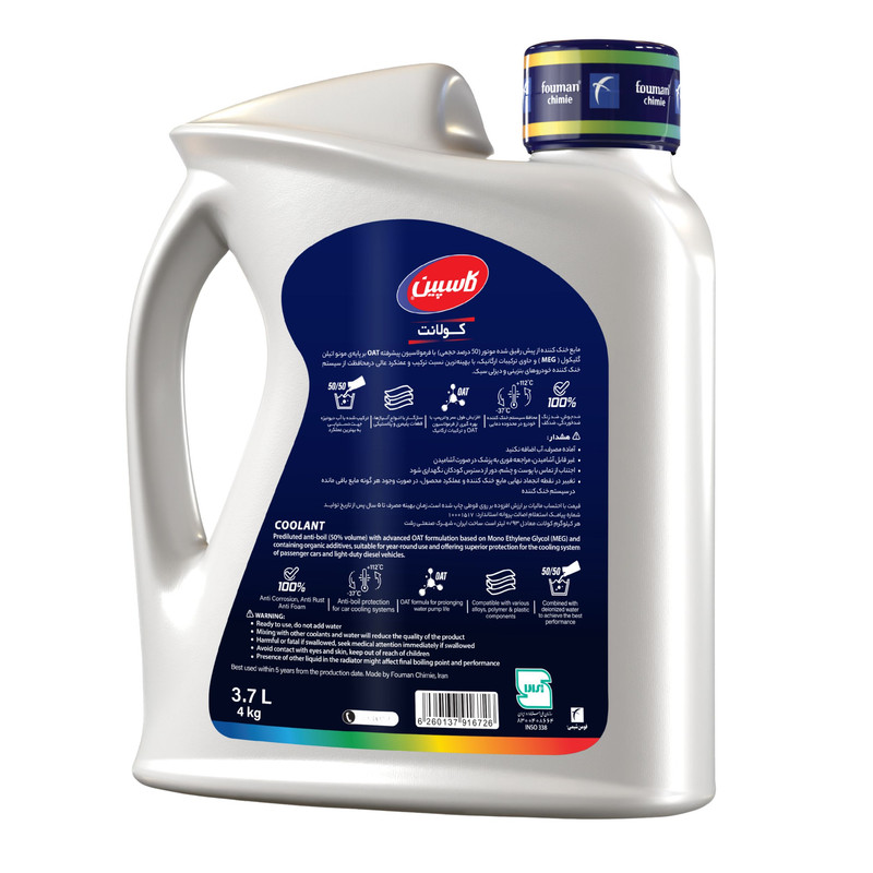 ضدیخ کاسپین مدل کولانت 50/50 حجم 3.86 لیتری جزء بهترین ضدیخهایی است که میتوانید برای خودروی خود تهیه کنید. ترکیبات موجود در آن، این محصول را مجهز به خواص فوق العاده ای از جمله ضد خوردگی، ضد زنگ و ضد رسوب کرده است. محدوده دمایی وسیعی که این ضدیخ مرغوب پوشش می دهد موجب می شود از این محصول در تمام فصل های سال به راحتی استفاده کنید. این ضدیخ نیاز به ترکیب شدن با آب ندارد. از لحظه ای که درب آن را باز کنید، آماده مصرف است. در سردترین نقاط کشور که باشید می توانید از خواص ویژه این ضدیخ بهره مند شوید. محافظت دمایی ضدیخ کاسپین مدل کولانت بین منفی 37 درجه سانتی گراد تا مثبت 112 درجه سانتی گراد است. ضدیخ کاسپین مدل کولانت 50/50 حجم 3.86 لیتری دارای ویژگیهای منحصر به فردی است: رادیاتور خودرو از زنگ زدگی، رسوب، خوردگی و خورندگی در امان می ماند. مطابق با استاندارد ملی ایران به شماره 338 تولید شده است و برای استفاده در خودروهای داخل کشور مناسب است. در فصل تابستان به عنوان مایع ضد جوش و خنک کننده موتور خودرو عملکرد فوق العاده ای دارد. با ترکیباتی که دارد از آسیب ها و هزینه های گزاف تعمیر خودرو جلوگیری می کند. با تمام این توصیفات، استفاده از این ضدیخ بسیار به صرفه است.