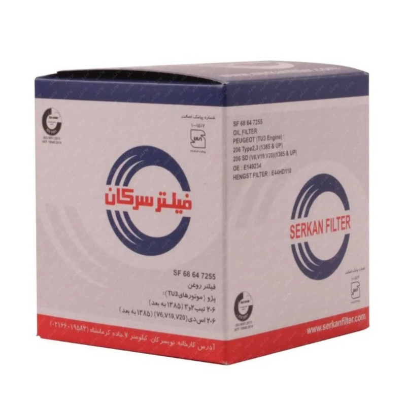 فیلتر روغن مخصوص پژو 206 تیپ 2 و 3 و پژو 206sd v6,v19,v20 که در آنها از موتور TU3 استفاده گردیده است و از سال 1386 به بعد تولید شده باشد. تولید شده در شرکت سرکان فیلتر