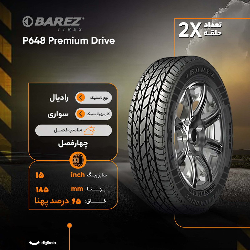 لاستیک خودرو بارز مدل P648 Premium Drive با سایز ۱۸۵/۶۵R۱۵ از نوع رادیال برای خودروهای سواری طراحی شده است. این لاستیک چهار فصل با پهنای ۱۸۵ میلیمتر و فاق ۶۵ درصد عملکرد قابلقبولی در شرایط جوی مختلف ارائه میدهد. طرح آج آن به گونهای است که چسبندگی بالا و کاهش صدای حرکت را تضمین میکند.