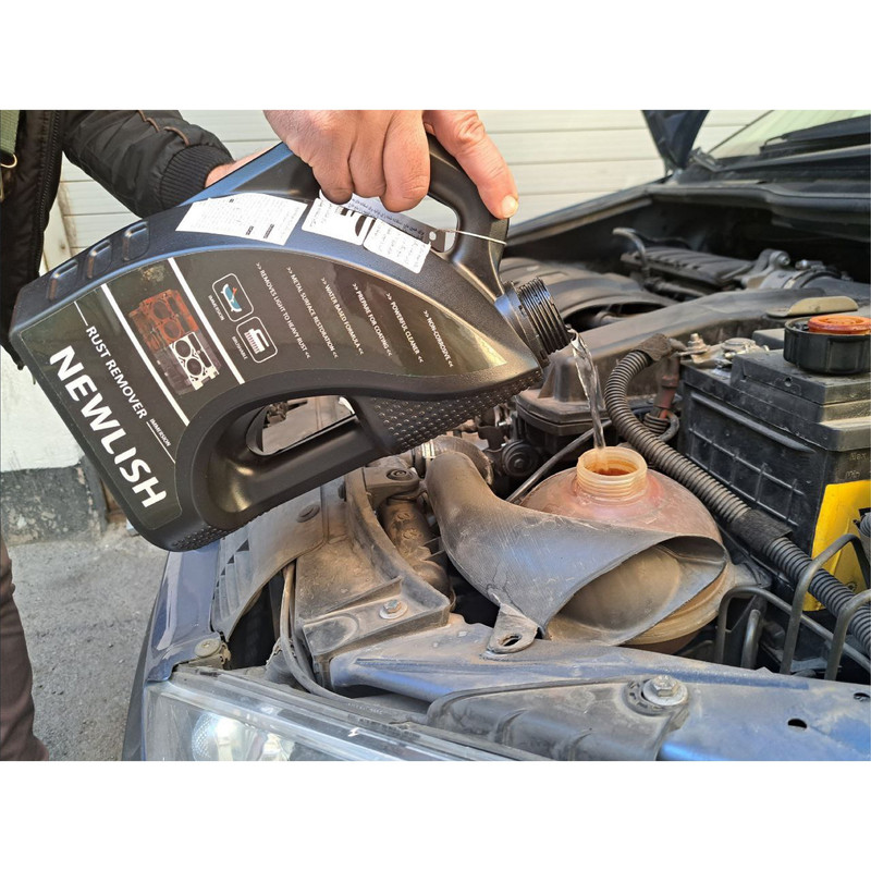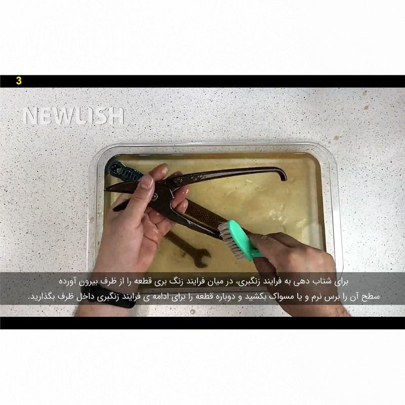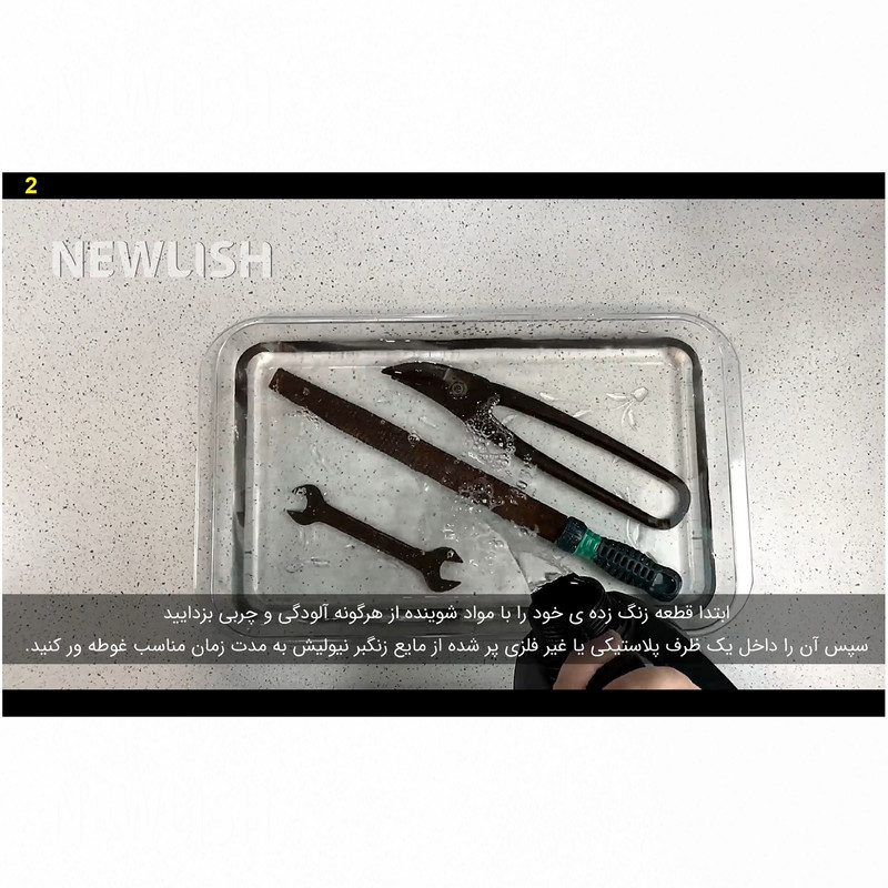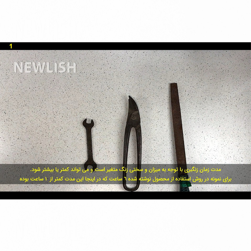 مایع زنگ بر نیولیش بدون اسید جوهر نمک، بدون بو، پایه آب، خنثی، غیر آتشگیر برای زنگ زدایی انواع قطعات فلزی، استیل، ورق های استیل، ورق های گالوانیزه و چدن. از بین بردن زنگ زدگی و رسوب رادیاتور موتورهای دیزل و بنزینی، از بین بردن زنگ زدگی رسوب و جرم باک بنزین و رادیاتور موتور سیکلت، از بین بردن زنگ زدگی رسوب و جرم رادیاتور پکیج ساختمان، از بین بردن زنگ زدگی قطعات حساس به اسید و دارای آبکاری، بدون آسیب به آلومینیوم و قطعات آلومینیومی، مس و و برنج، از بین بردن زنگ زدگی آچار و ابزارآلات، مته، شیرآلات و... بدون آسیب به آبکاری و بدون خورندگی، مایع زنگ بر نیولیش به دلیل خنثی بودن دارای حداقل آسیب پوستی می باشد. مایع زنگ بر نیولیش برای از بین بردن زنگ زدگی انواع قطعات فلزی خانگی و صنعتی ، از بین بردن اکسیداسیون قطعات مسی و برنجی دارای کاربرد می باشد.