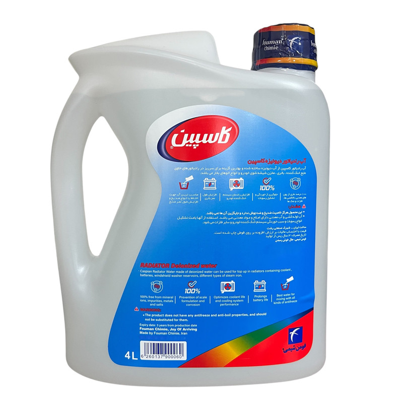 در کنار آن، آب رادیاتور دیونیزه کاسپین باحجم 4 لیتر، با خلوص ۱۰۰ درصد، فاقد یونهای معدنی، فلزات، نمکها و ناخالصیهاست. این آب تخصصی برای استفاده در رادیاتورهای حاوی مایع خنککننده، باتری خودرو، مخزن شیشهشوی و حتی اتوهای بخار مناسب است. استفاده از آب دیونیزه باعث افزایش راندمان سیستم خنککننده، جلوگیری از خوردگی و رسوبگذاری، و افزایش طول عمر باتری و ضدیخ میشود. توجه داشته باشید که این محصول خاصیت ضدیخ یا ضدجوش ندارد و جایگزین آنها نیست، بلکه مکملی ایدهآل برای ترکیب با ضدیخ محسوب میشود.