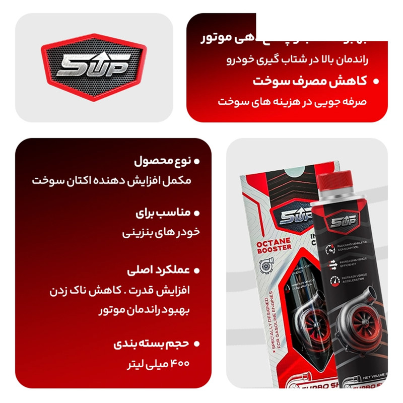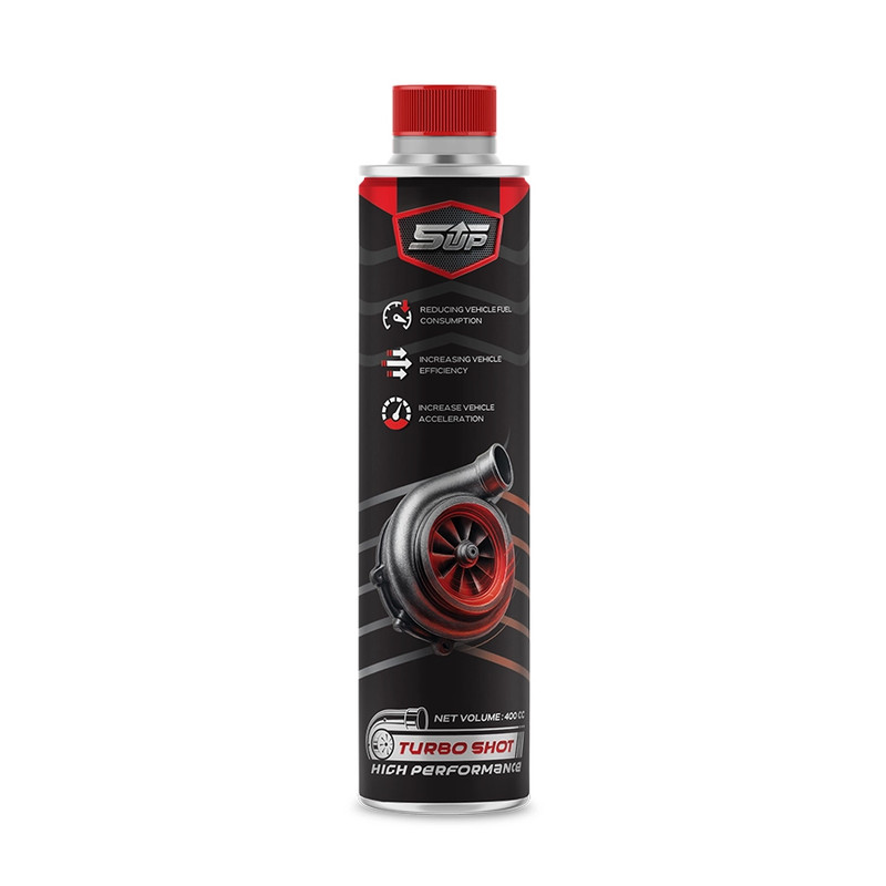 یک بطری کامل ۴۰۰ میلیلیتری 5UP Turbo Shot را به باک سوخت اضافه کنید. بهترین زمان مصرف، قبل از سوختگیری یا هنگام پر بودن باک است.