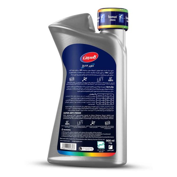 ضدیخ سوپر کاسپین مطابق با استاندارد ۳۳۸ ایران و با فناوری OAT در حداکثر سازگاری با فناوری موتورها و با آبوهوای ایران فرموله شده است و در محدوده دمایی ۳۷- درجه سانتیگراد تا ۱۱۲+ سانتیگراد قابل استفاده است. این ضدیخ غلیظ میباشد و برای دستیابی به مناسبترین محدوده دمایی باید مطابق با جدول مندرج بر روی لیبل ضدیخ با آب دییونیزه (آب رادیاتور کاسپین) و یا آب مقطر رقیق شود.