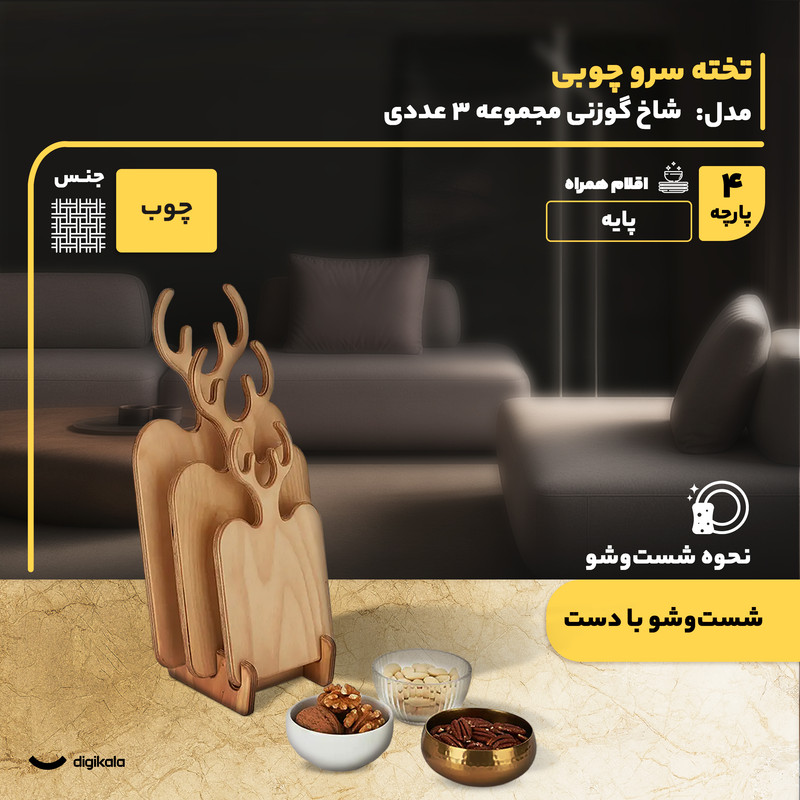 توضیحات ابعاد ظروف: تخته کوچک: 25.5x15 سانتیمتر - تخته متوسط: 20x33 سانتیمتر - تخته بزرگ: 22.5x28.5 سانتیمتر - ضخامت: 13 میلیمتر سانتیمتر - پایه: 13x13x5.5 سانتیمتر