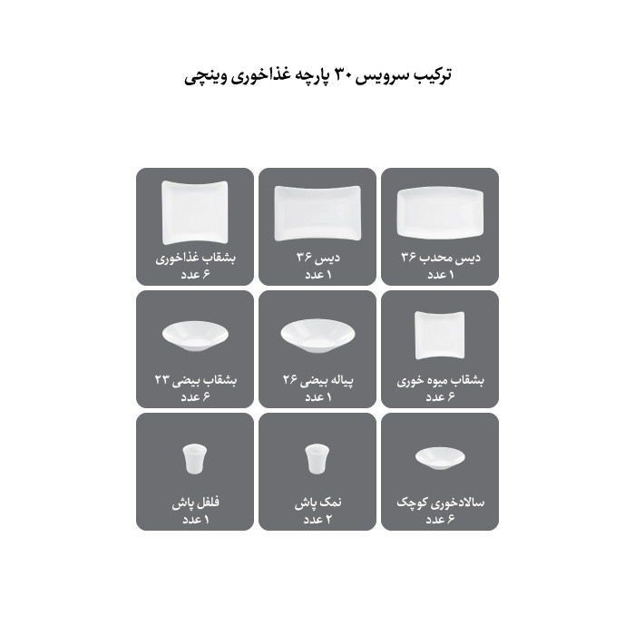 اقلام سرویس: ظرف سالاد , سالادخوری , دیس , بشقاب غذاخوری , بشقاب خورشخوری , پیشدستی , نمکپاش و فلفلپاش