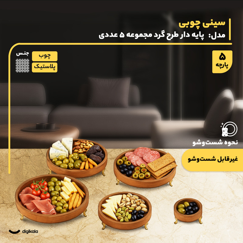 توضیحات ابعاد ظروف: از ظرف کوچکتر به بزرگتر: 23x23 - 19.5x19.5 - 16.5x16.5 - 13x13 - 10x10 سانتیمتر - ارتفاع: 5.5 سانتیمتر