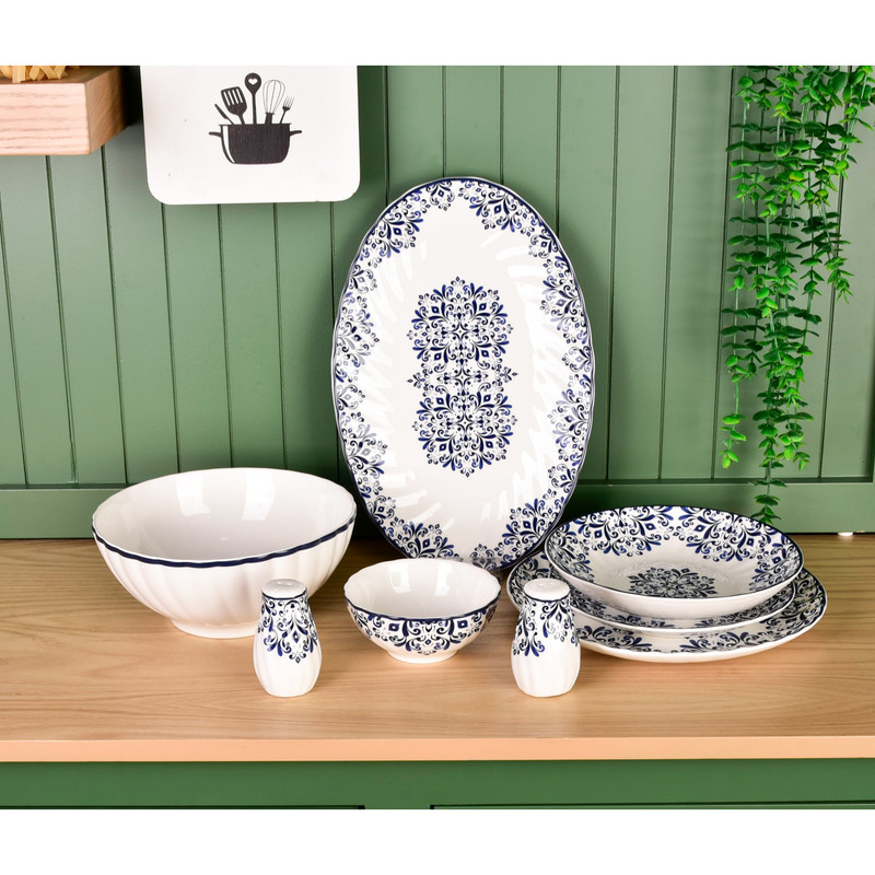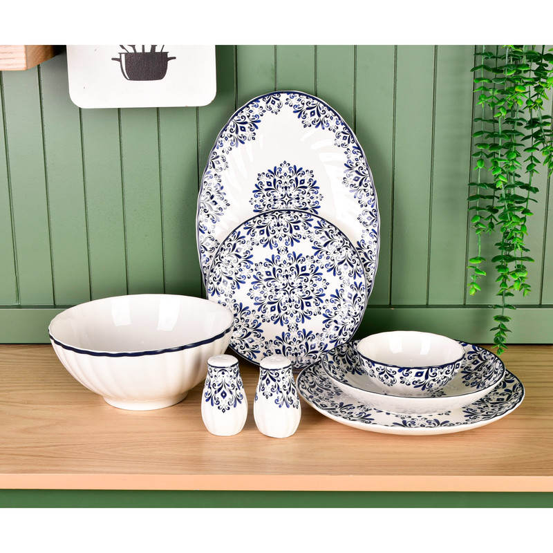اقلام سرویس: بشقاب غذاخوری , ظرف سالاد , دیس , پیشدستی , بشقاب خورشخوری , پیاله , نمکپاش و فلفلپاش