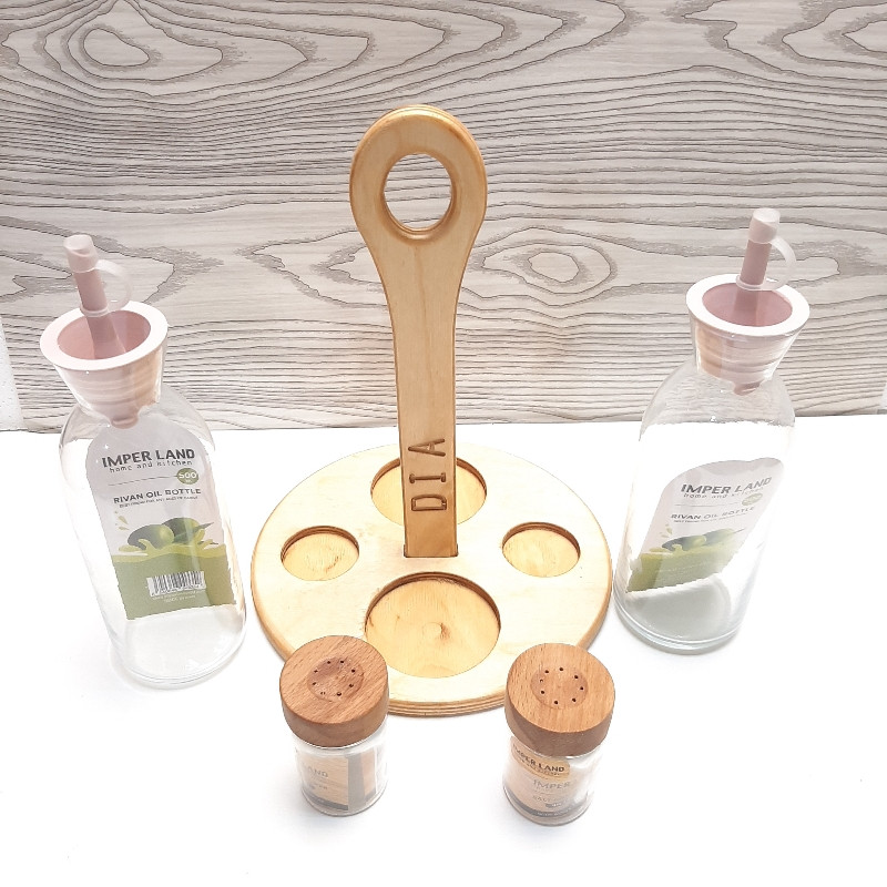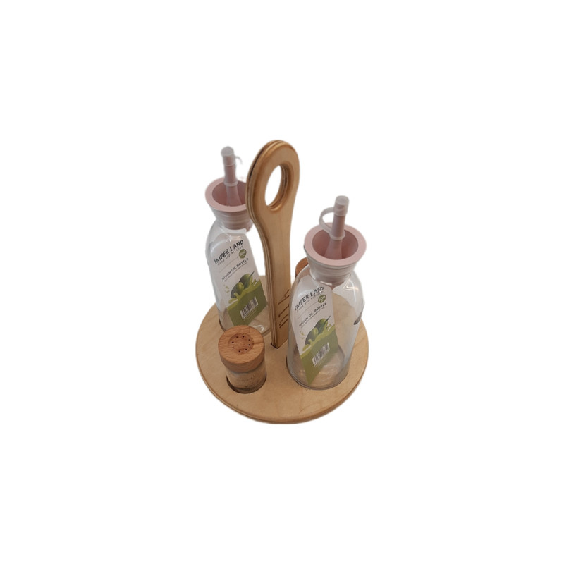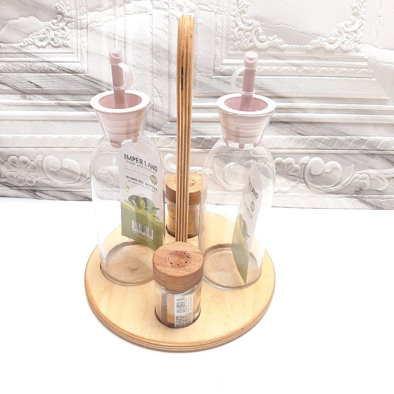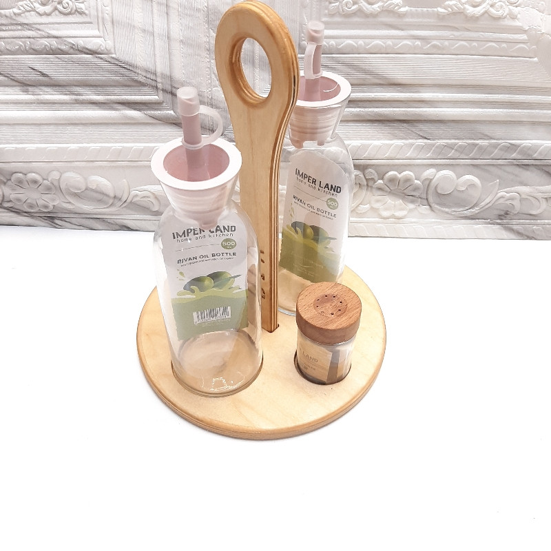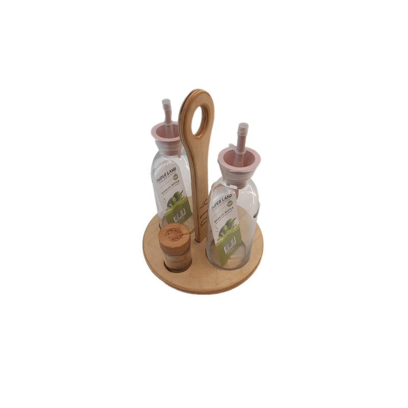 این ست تشکیل شده است از 2 عدد روغن ریز بزرگ 500 میل شیشه ای و 2 عدد نمک و فلفل پاش شیشه ای با درب چوبی و یک استند چوبی طراحی شده برای این ست که زیبایی 2 چندان به این محصول بخشیده