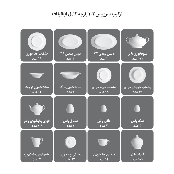 اقلام سرویس: سوپخوری , سالادخوری , دیس , بشقاب غذاخوری , بشقاب خورشخوری , پیشدستی , قوری چایخوری , فنجان , نعلبکی , قندان , شکرریز , نمکپاش و فلفلپاش , پیاله