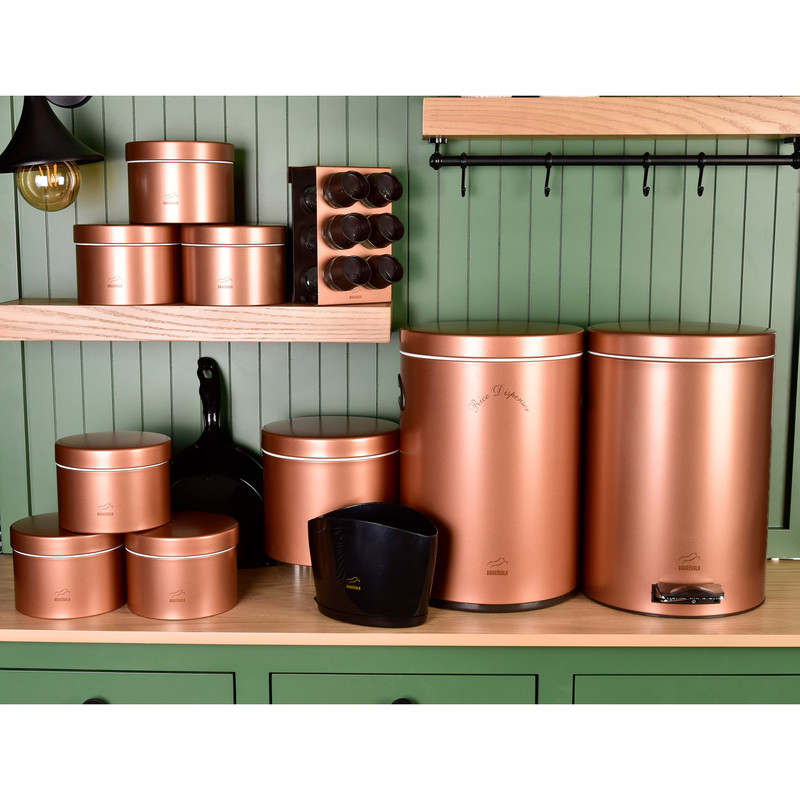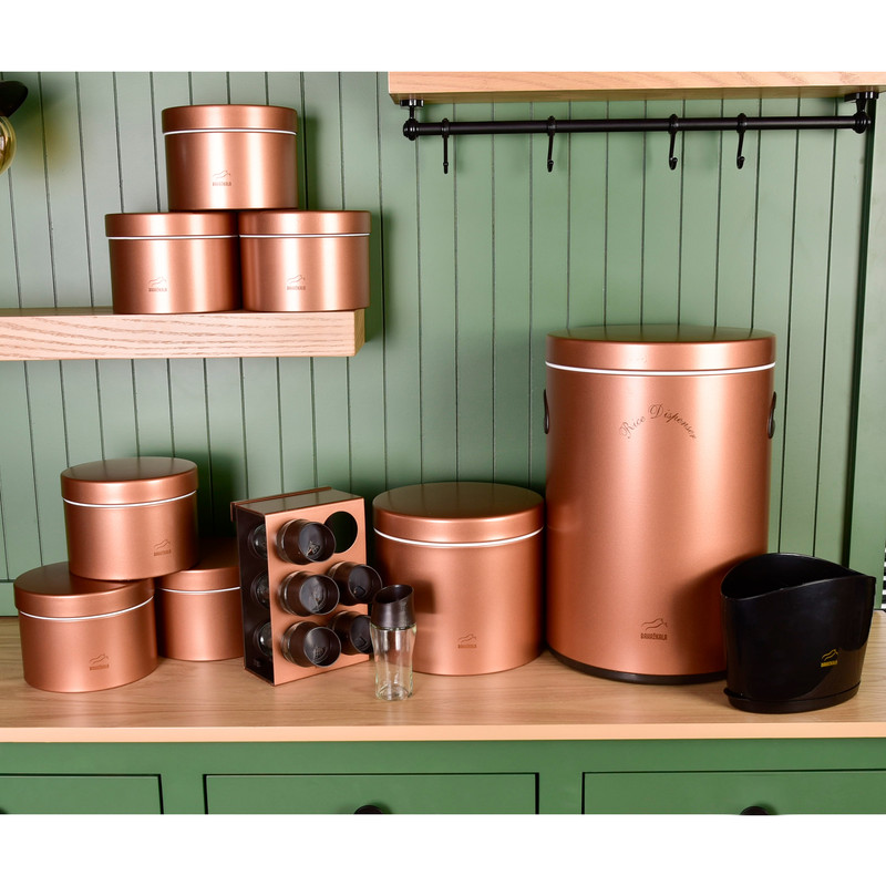 این ست شامل : 6 عدد جای ادویه ، 1 عدد استند ، 6 عدد ظرف حبوبات، 1 عدد سطل زباله ، 1 عدد سطل برنج ،1 عدد جای قند ، 1 عدد خاک انداز ، 1 عدد جاقاشقی