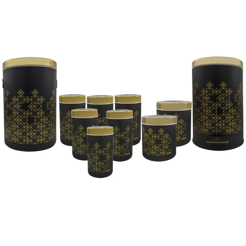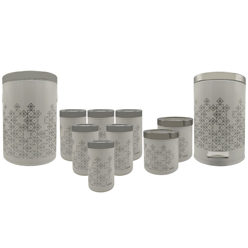 سرویس 10 پارچه بهازکالا از جنس فلز با کیفیت بسیار بالا در دو رنگ سفید و مشکی میباشد و دارای یک عدد سطل برنج،یک عدد سطل زباله،یک عدد سطل قند،یک عدد سطل شکر،6عدد بانکه است.