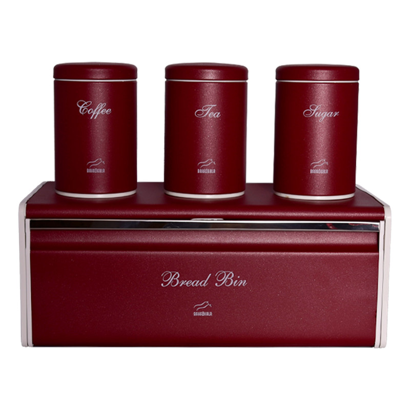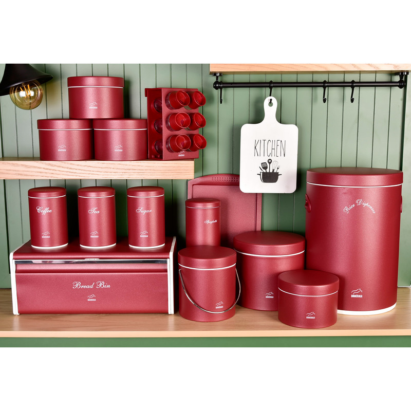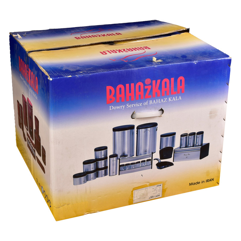 این ست شامل : 6 عدد جای ادویه ، 1 عدد استند ، 4 عدد ظرف حبوبات، 1 عدد سطل زباله ، 1 عدد سطل برنج ، 1 عدد جای قند، 1 عدد جای شکر. 1 عدد سینی ، 1 عدد خاک انداز ، 1 عدد سطل زباله ساده، 1 عدد ظرف نان ، 3 عدد پاسماوری ، 1 عدد بانکه ماکارانی