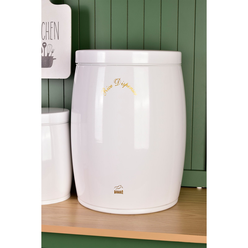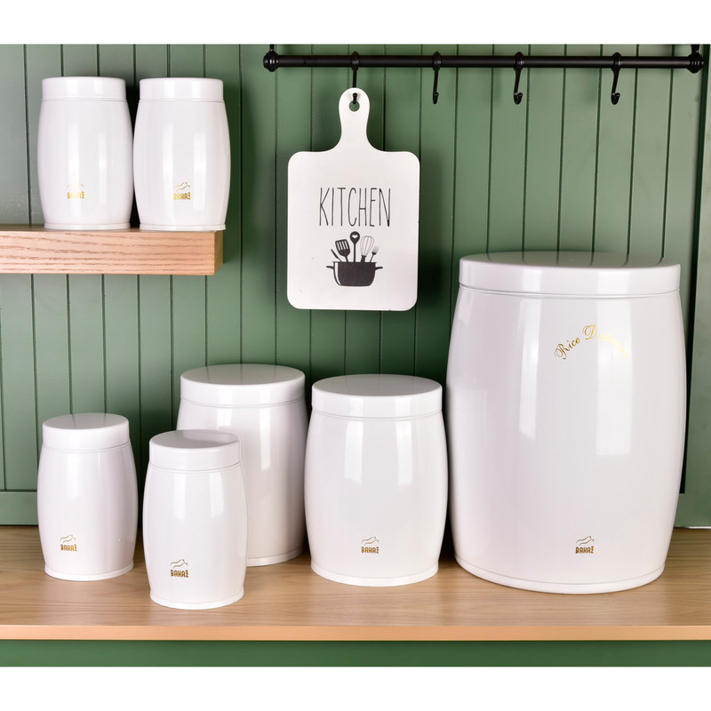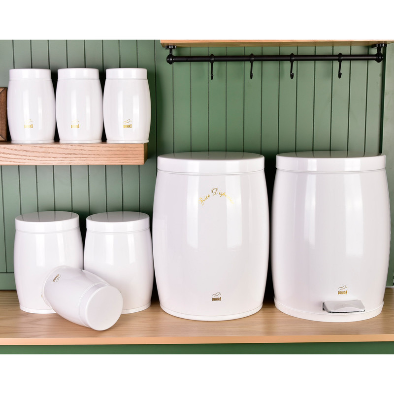 این ست شامل : 1 عدد سطل زباله ، 1 عدد سطل برنج ، 1 عدد سطل قند ، 1 عدد سطل شکر، 4 عدد جا حبوبات