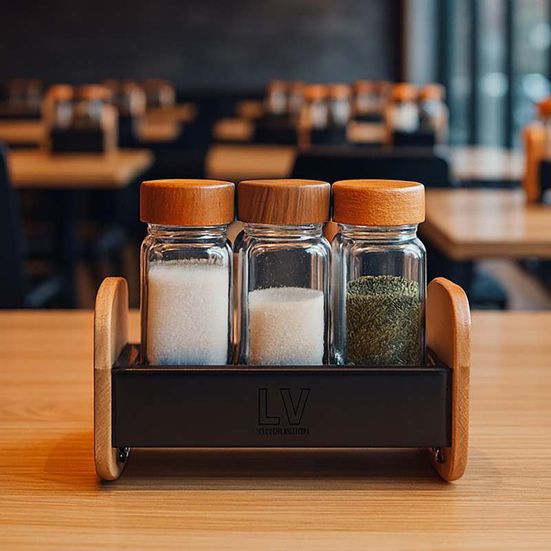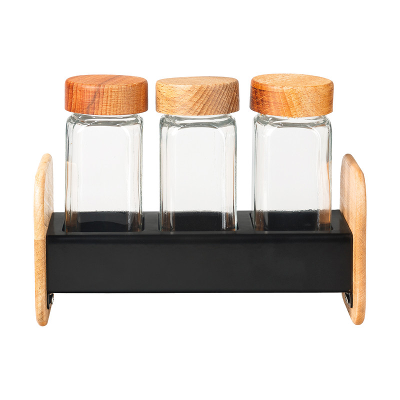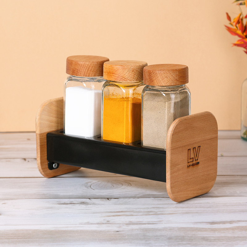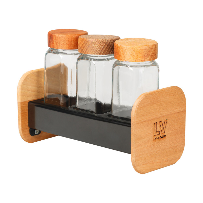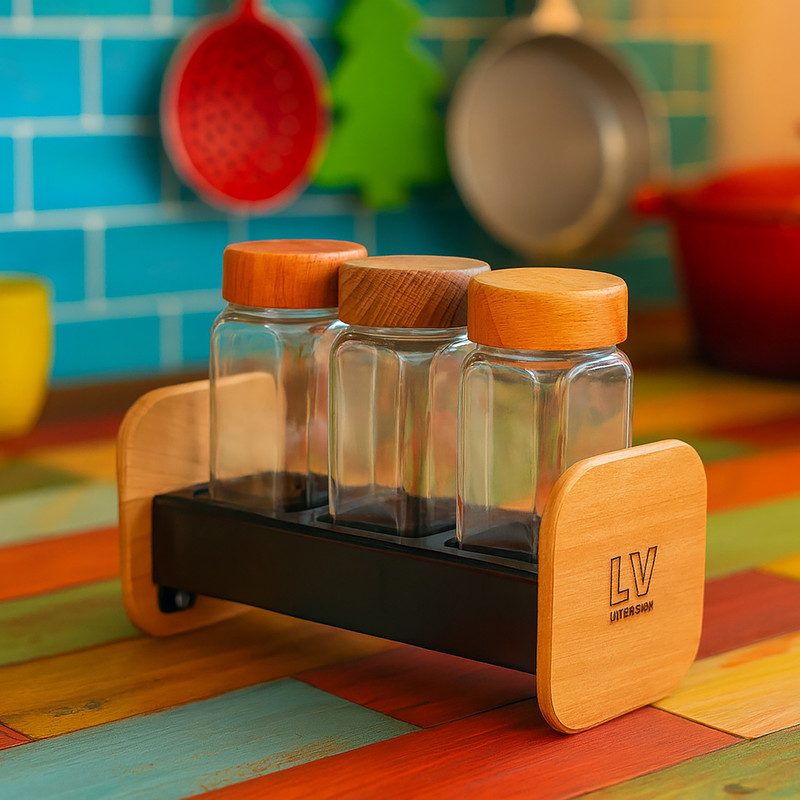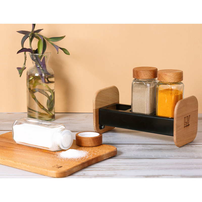 استند نگهدارنده فلز و چوب مدرن ال وی به همراه 3 عدد ادویه پاش شیشه ای با درب چوبی (ساخته شده از چوب راش) میتواند زیبایی خاصی به آشپزخانه شما بدهد.