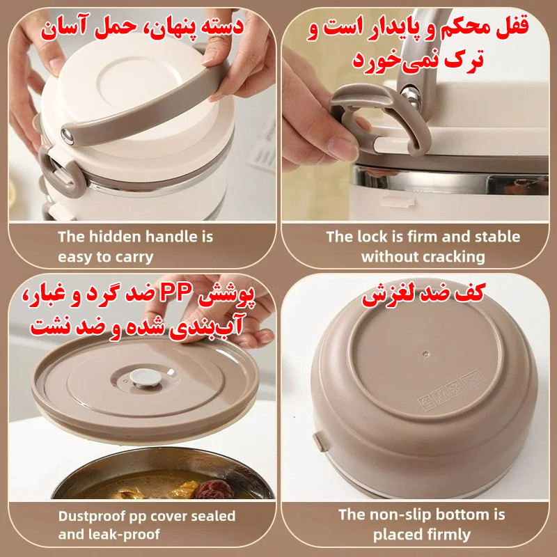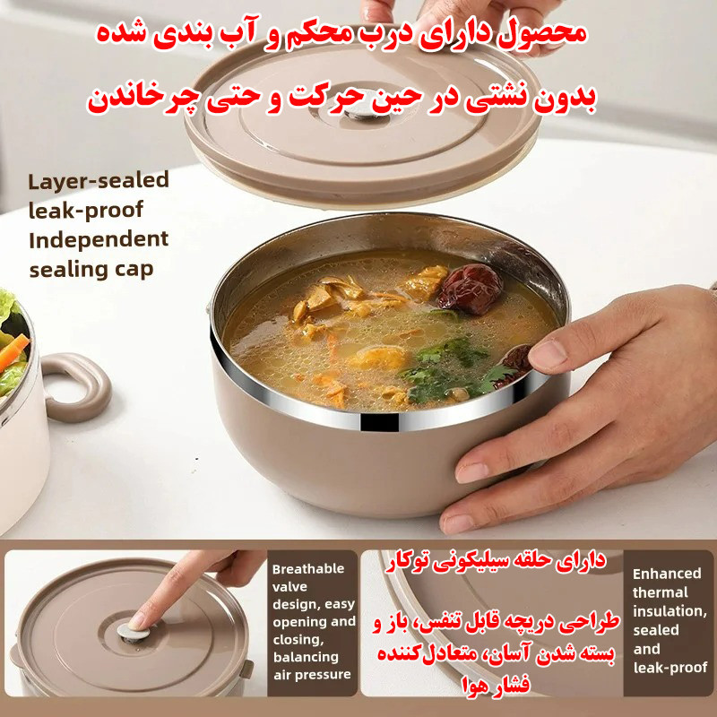 در دنیای پرشتاب امروز، لذت بردن از یک وعده غذایی گرم، سالم و خانگی در محل کار، دانشگاه یا در سفر، یک موهبت بزرگ است. ظرف غذای ایزوله حرارتی ما با فناوری پیشرفته و طراحی کاربردی، این امکان را برای شما فراهم میکند تا طعم و کیفیت غذای محبوبتان را ساعتها پس از پخت، درست مانند لحظه اول، حفظ کنید. این محصول فراتر از یک ظرف ساده، همراهی هوشمند برای سبک زندگی سالم شماست که به شما اطمینان میدهد در هر شرایطی، از غذایی دلچسب و گرم لذت خواهید برد. راز کارایی بینظیر این ظرف در ساختار چندلایه و پیشگام آن نهفته است. لایه داخلی از فولاد ضد زنگ ۳۰۴، که بهترین انتخاب برای تماس با مواد غذایی است، ساخته شده تا سلامت، طعم و بوی غذای شما بدون هیچ تغییри حفظ شود. لایه بیرونی نیز از پلیمر ضخیم شده و باکیفیت ساخته شده که علاوه بر زیبایی، به دوام و کارایی کلی ظرف میافزاید. مهمترین دغدغه هنگام حمل غذا، جلوگیری از نشت آن است. این ظرف با طراحی کاملاً آببندی شده، این نگرانی را برای همیشه برطرف میکند. درب محکم آن مجهز به یک واشر سیلیکونی انعطافپذیر است که به طور کامل دهانه ظرف را پوشانده و از هرگونه نشتی، حتی هنگام حمل سوپ و مایعات، جلوگیری میکند. برای سهولت در حمل، یک دسته محکم و مخفی شونده نیز بر روی درب طراحی شده است که در مواقع عدم نیاز، به صورت صاف روی درب قرار میگیرد. این محصول در سایز کاربردی 2100 میلیلیتری عرضه میشود تا بتوانید بر اساس نیاز خود، بهترین گزینه را انتخاب کنید.