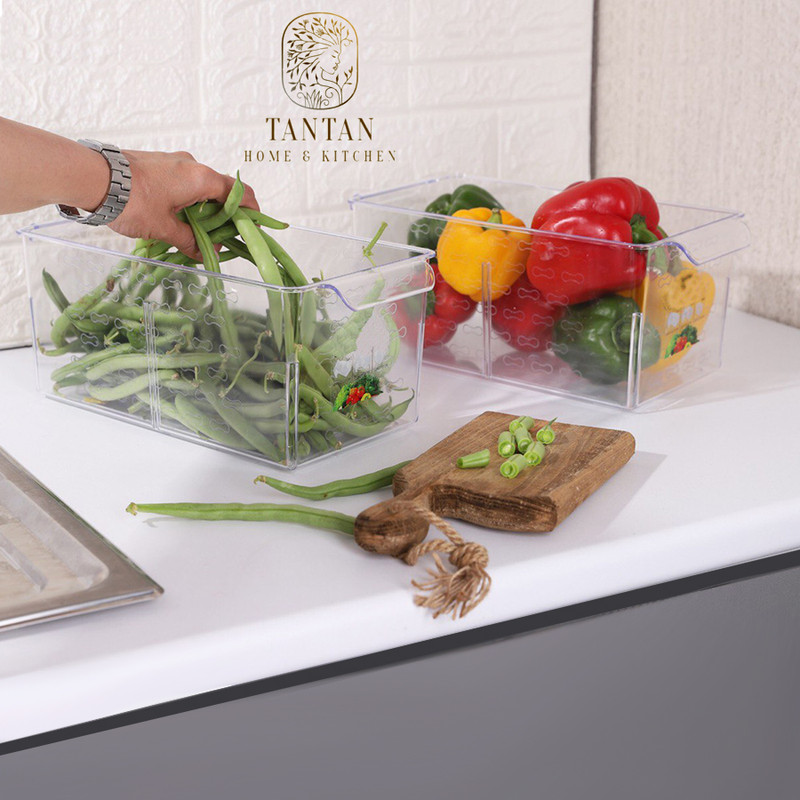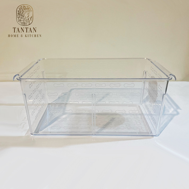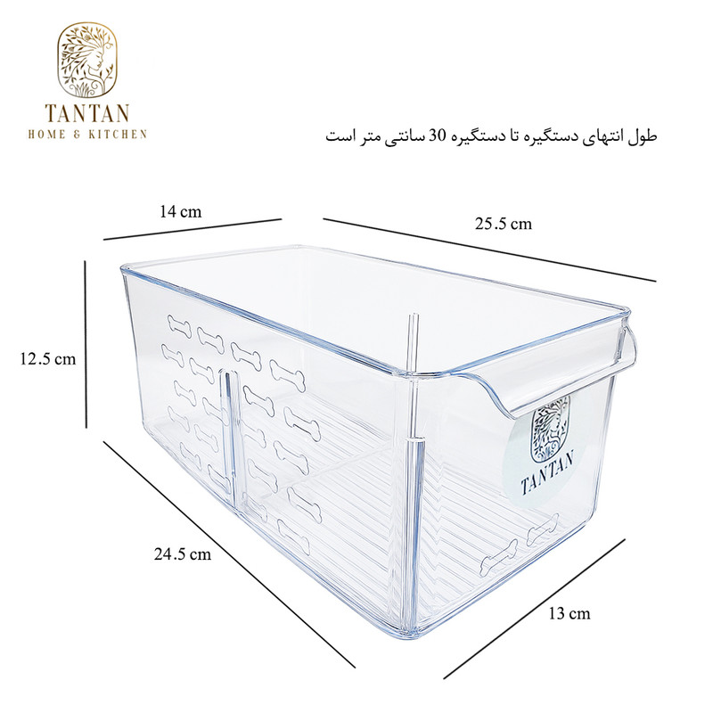 سبد نظم دهنده یخچال تن تن طرح کریستال سایز 2 ساخته شده از مواد درجه یک بوده و جنس بدنه آن پلاستیک کاملا شفاف و مقاوم میباشد. ابعاد این محصول با احتساب دستگیره طول 30 سانتی متر در عرض 14 سانتی متر در ارتفاع 12.5 سانتی متر است که دو عدد دسته در طرفین برای راحتی در حمل و جابجایی در آن تعبیه شده است. ابعاد دقیق سبد عبارتند: از قسمت بالا طول 25.5 در عرض 14 و قسمت پایین طول 24.5 در عرض 13 سانتی متر
