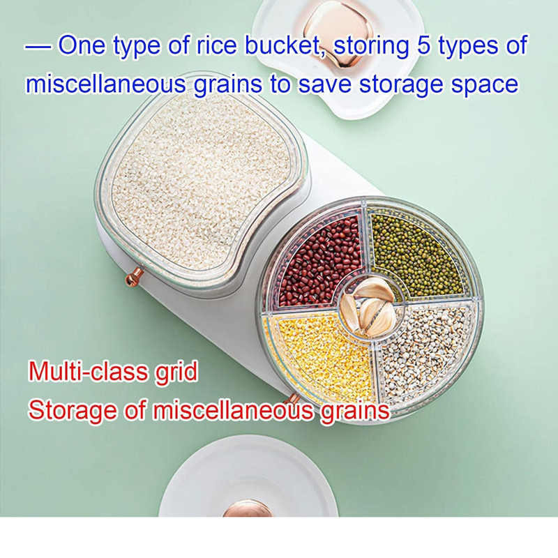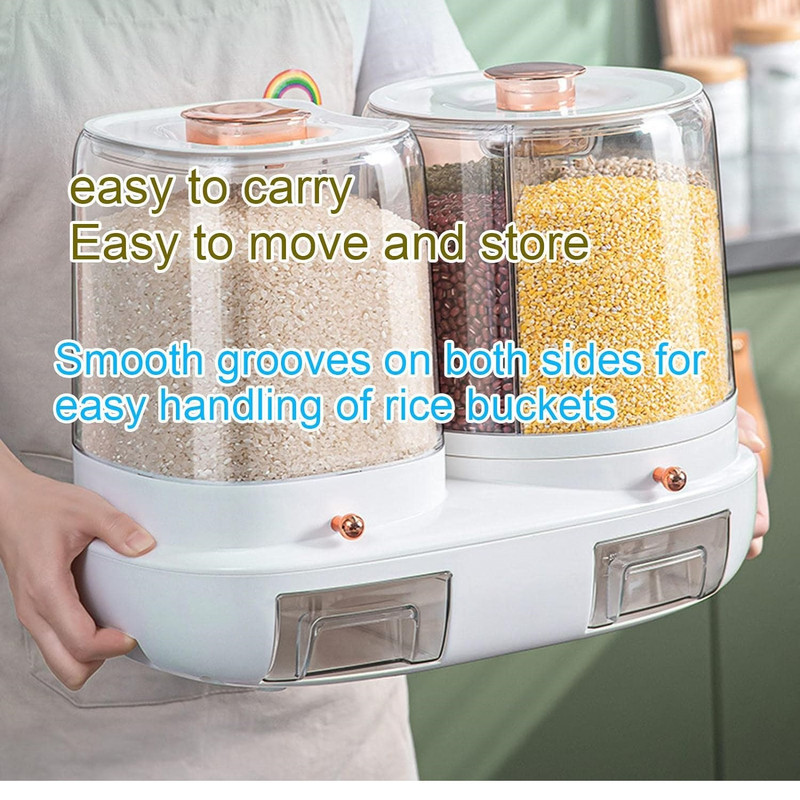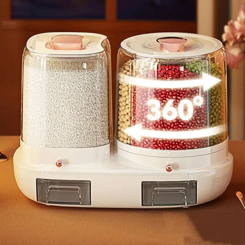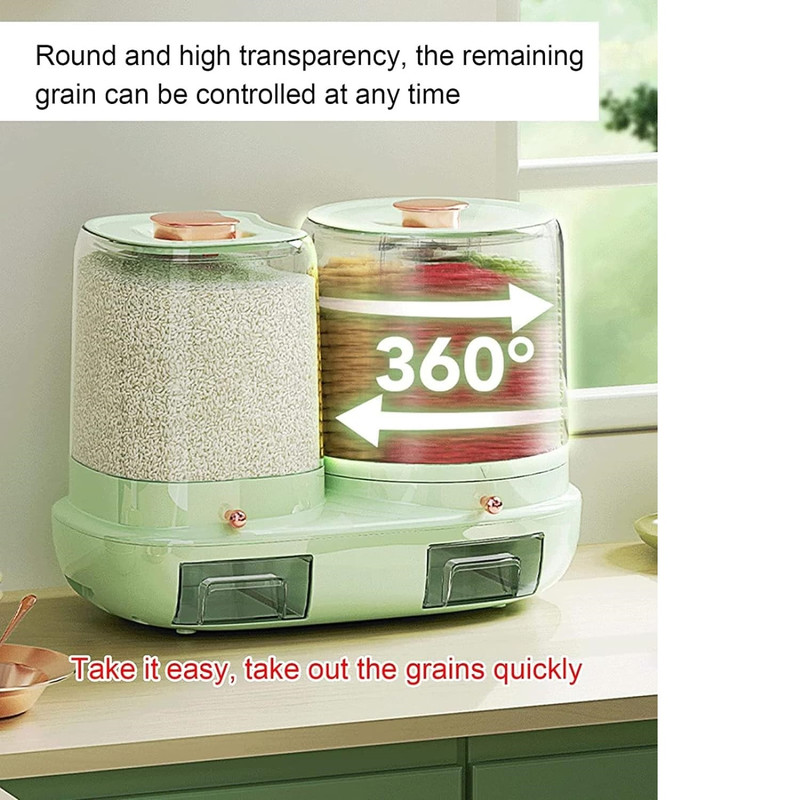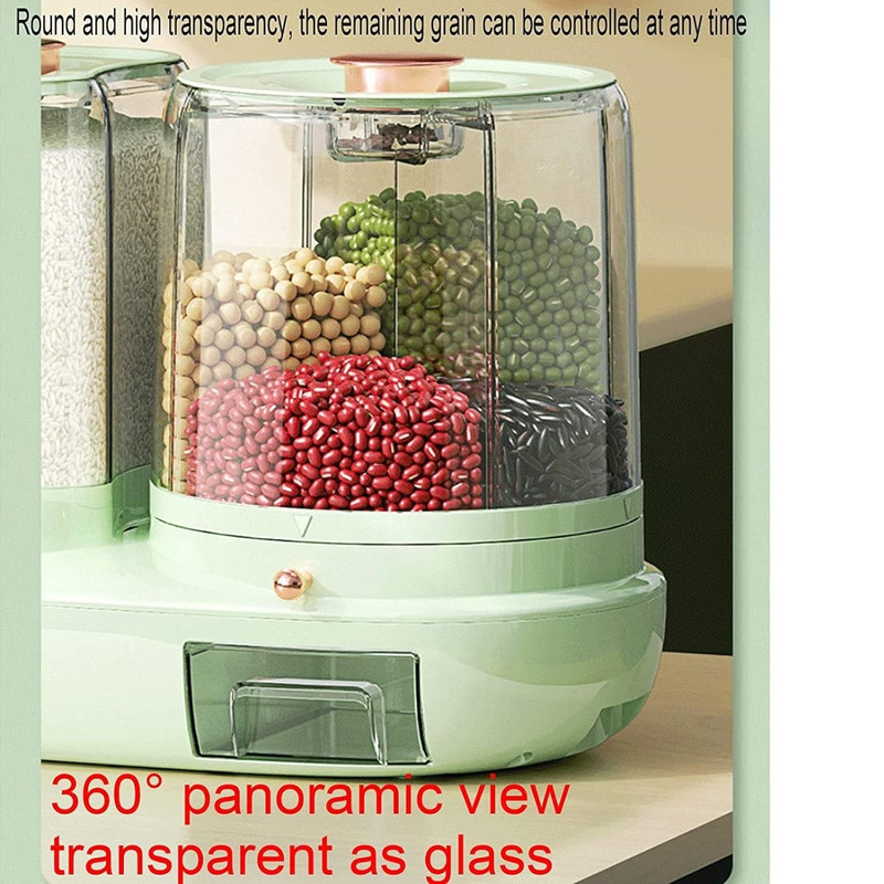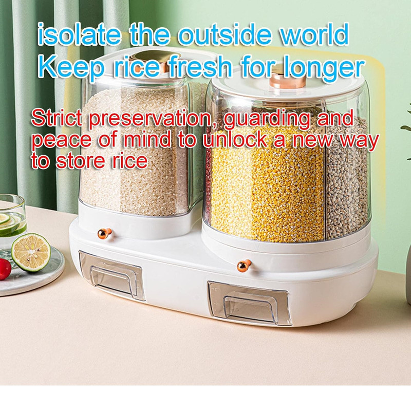 حجم زیاد و چند منظوره: برنج دان با ظرفیت بزرگ 25 پوند و مجهز به 5 شبکه ذخیره سازی، می تواند مواد غذایی خشک مختلف مانند ارزن، برنج سیاه، ذرت، سویا، ماش، لوبیا قرمز و غیره را در خود جای دهد. تلگراف غلات با طراحی قابل چرخش 360 درجه .