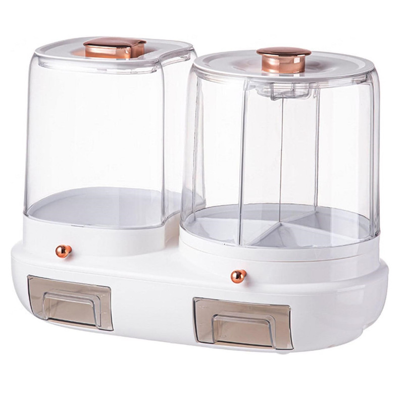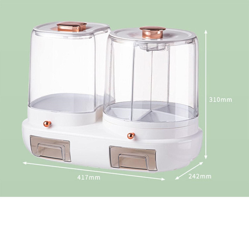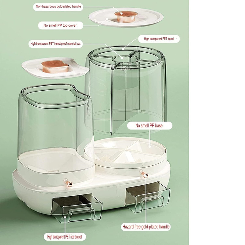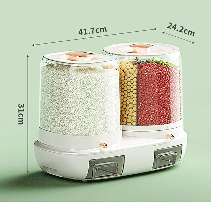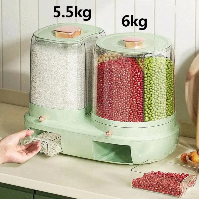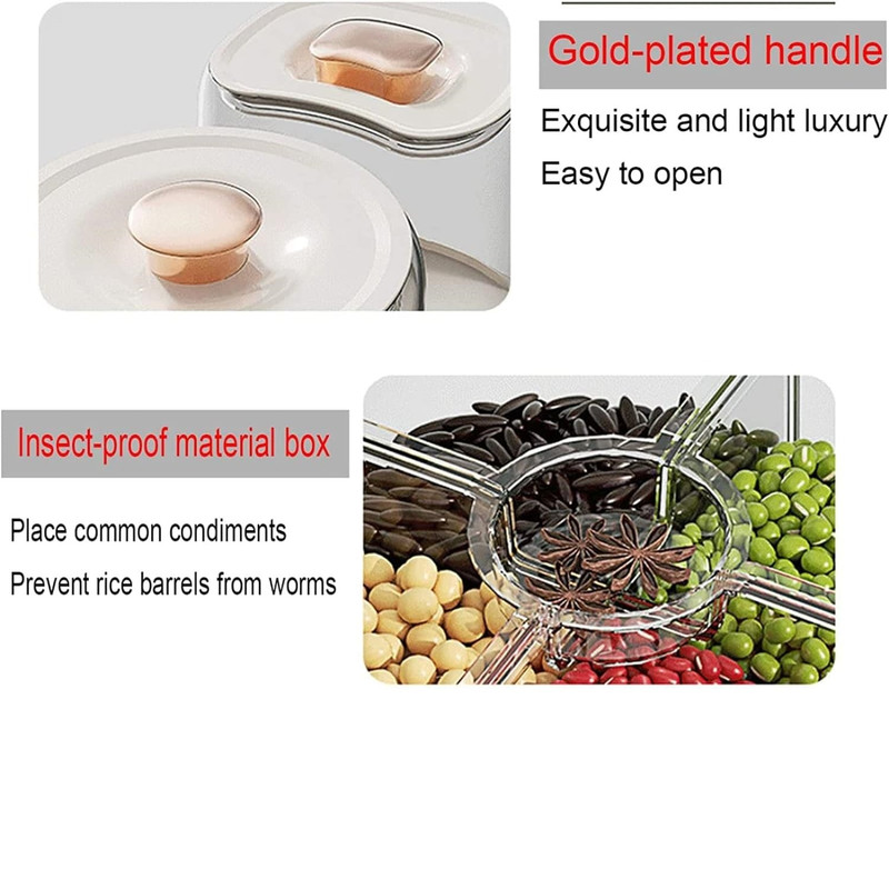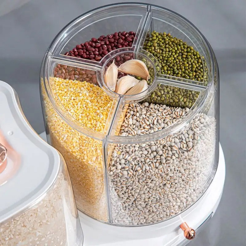 حجم زیاد و چند منظوره: برنج دان با ظرفیت بزرگ 25 پوند و مجهز به 5 شبکه ذخیره سازی، می تواند مواد غذایی خشک مختلف مانند ارزن، برنج سیاه، ذرت، سویا، ماش، لوبیا قرمز و غیره را در خود جای دهد. تلگراف غلات با طراحی قابل چرخش 360 درجه .