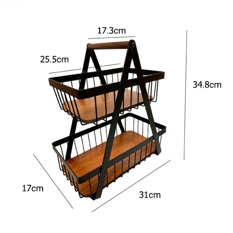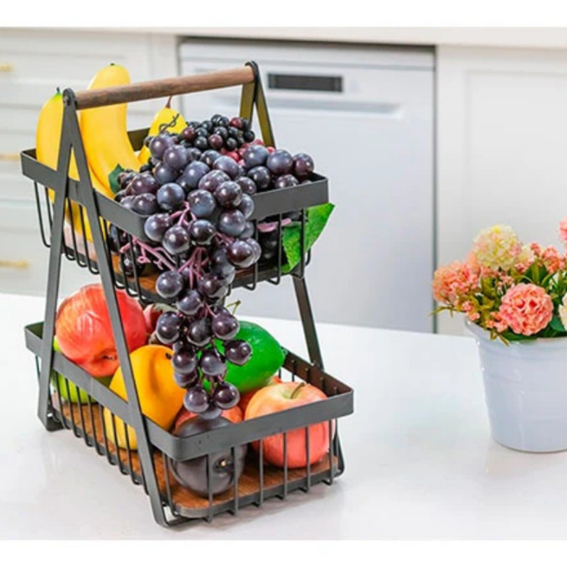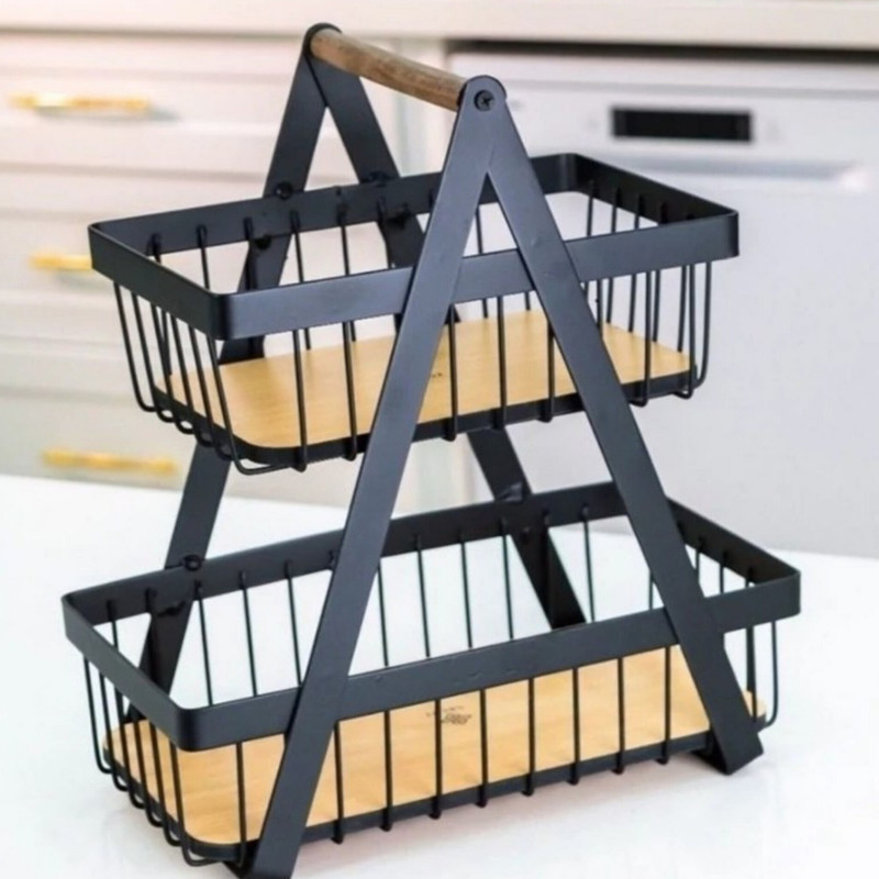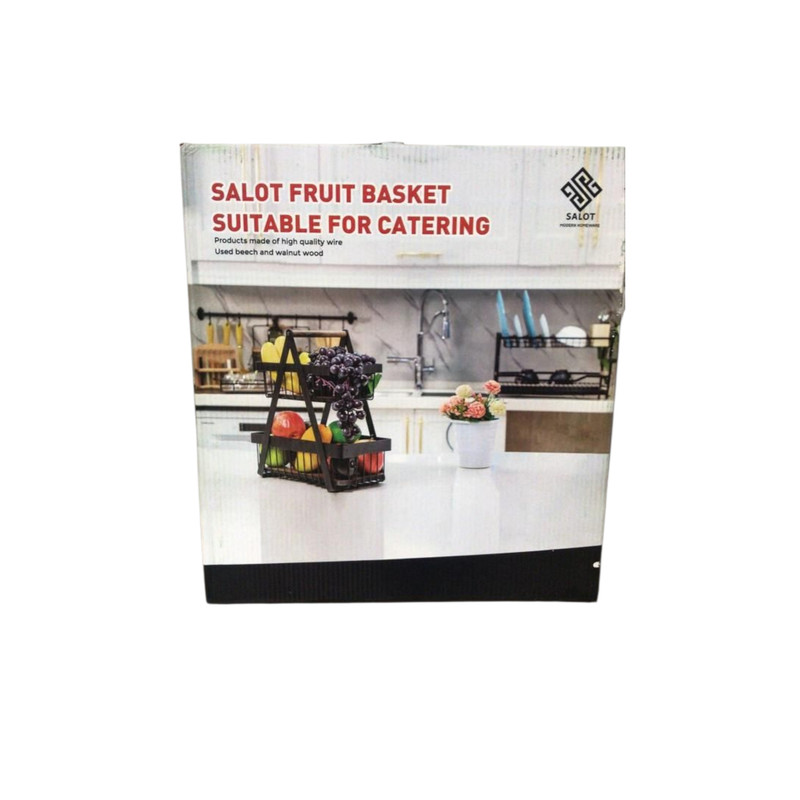 سبد میوه دو طبقه سالوت با طراحی نوین و ظاهری زیبا، گزینهای ایدهآل برای سرو میوه، شیرینی و دیزاین میز پذیرایی در منزل و مراسمهای مختلف است. این محصول از فلز آبکاری شده مشکی و کف چوبی مقاوم تولید شده و ترکیبی از زیبایی و استحکام را ارائه میدهد.
