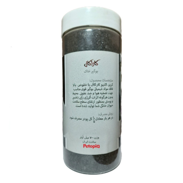 سایر توضیحات: کربن اکتیو بوگیر خاک پتوپیا مدل کاراکال با خلوص بالا فاقد مواد شیمیایی ، بوگیر قوی و مناسب جهت تصفیه هوا و ضدعفونی محیط بدون هرگونه اثرات آلرژی زایی ( پوستی و تنفسی ) به منظور ارتقای سطح سلامت حیوان خانگی شما تولید شده است .