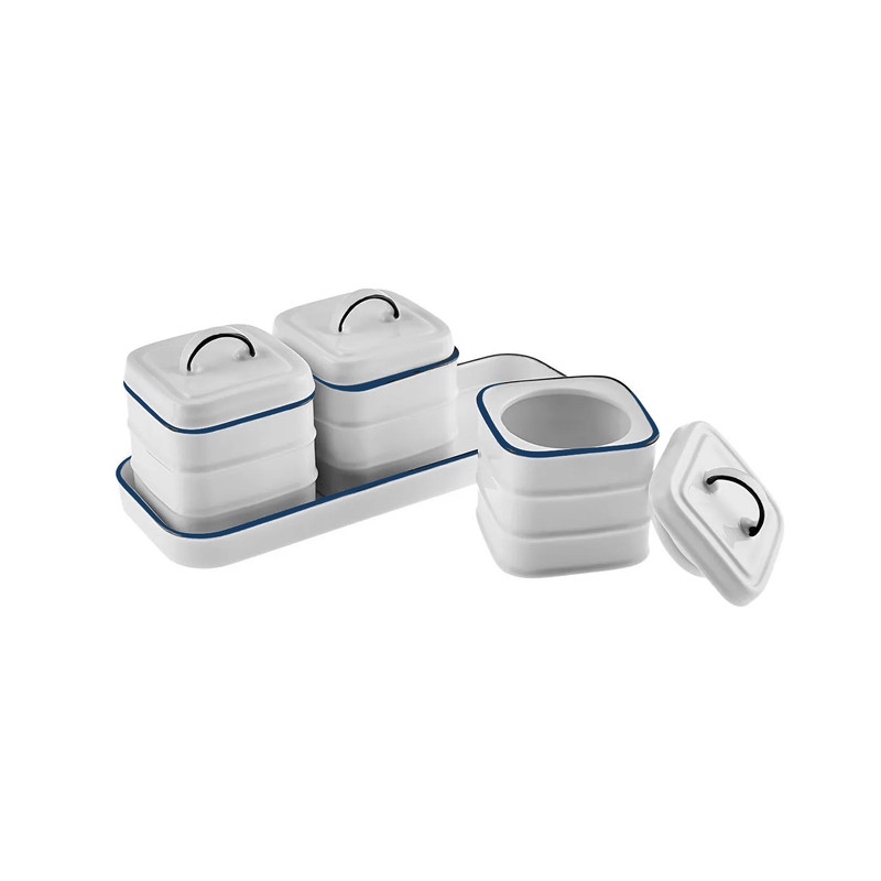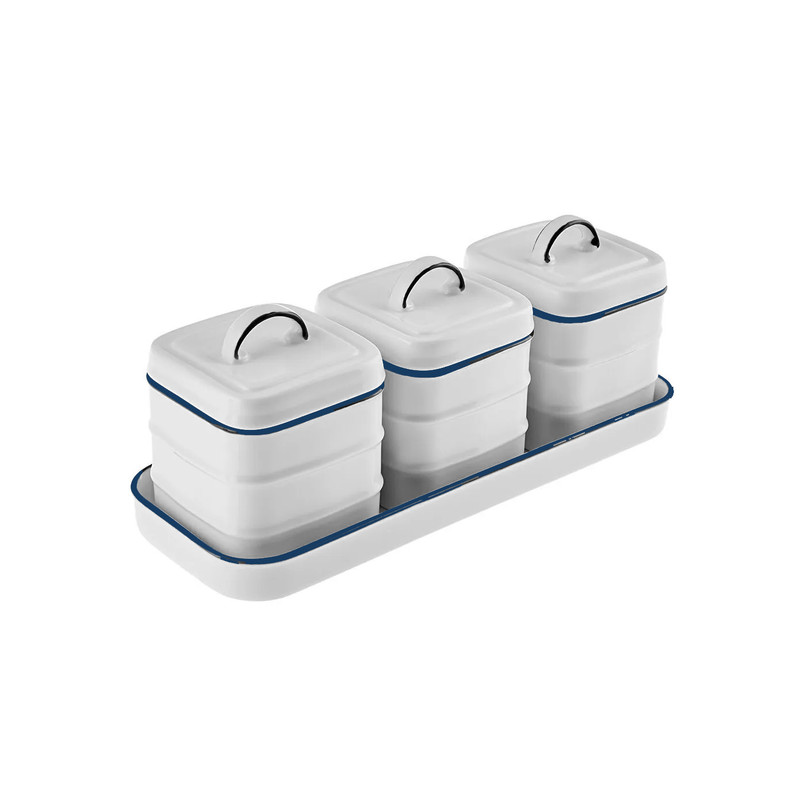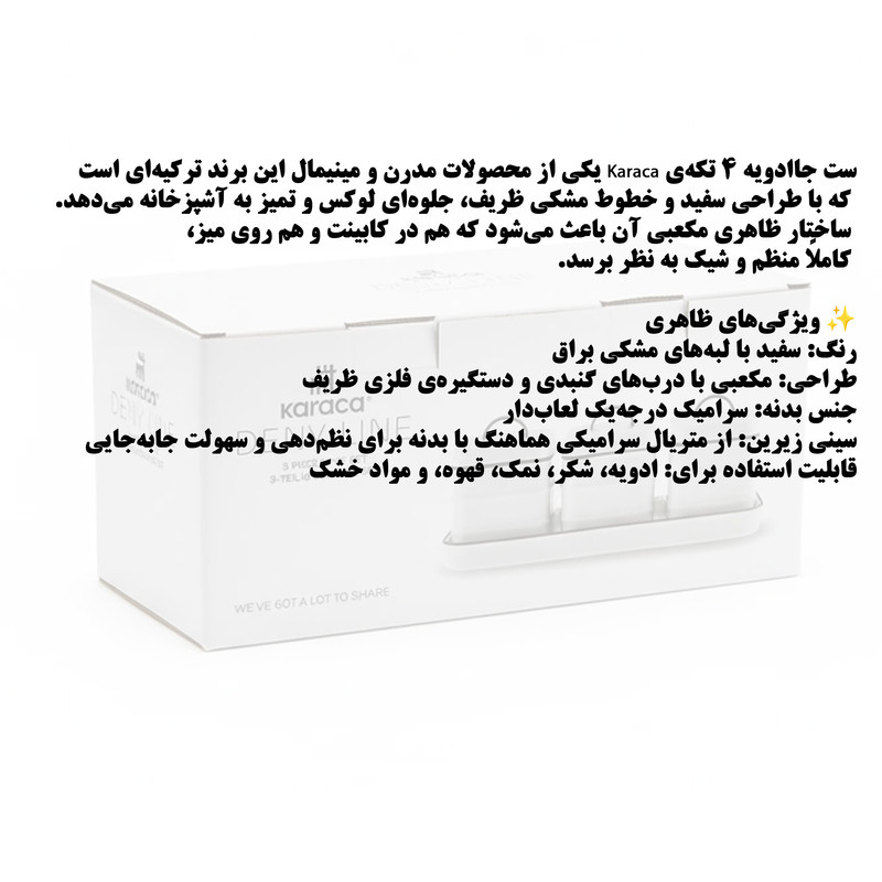 سایر توضیحات : ست جاادویه سهتکهی Karaca یکی از محصولات مدرن و مینیمال این برند ترکیهای است که با طراحی سفید و خطوط مشکی ظریف، جلوهای لوکس و تمیز به آشپزخانه میدهد. ساختار ظاهری مکعبی آن باعث میشود که هم در کابینت و هم روی میز، کاملاً منظم و شیک به نظر برسد.