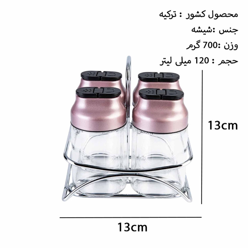 سایر توضیحات : محصول کشور : ترکیه - مجموعه 4 عددی به همراه استند استیل ضد زنگ به ابعاد: 12x13x12 - دارای 4 عدد جا ادویه حجم هر عدد : 120 میلی لیتر